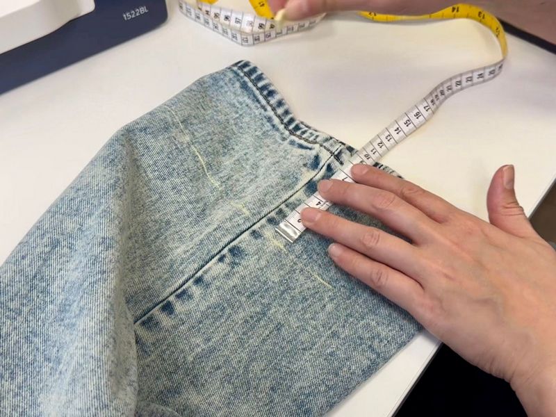 Сначала отмерьте нужную длину от фабричной строчки и определите, сколько сантиметров необходимо убрать. В нашем примере — 8 см.