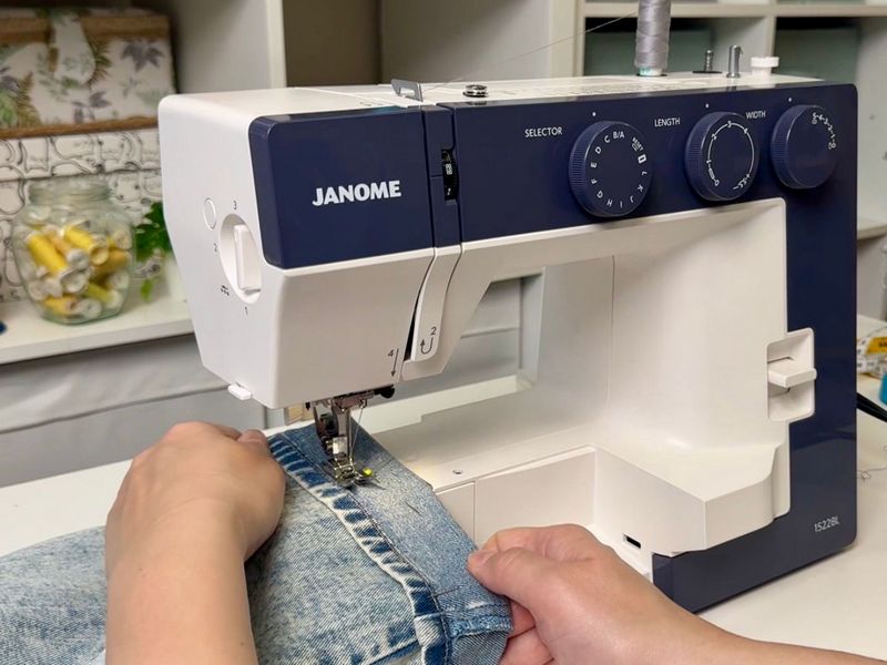В качестве примера используем Janome 1522BL — универсальную модель для домашних задач, которая хорошо справляется с джинсовой тканью и утолщениями.